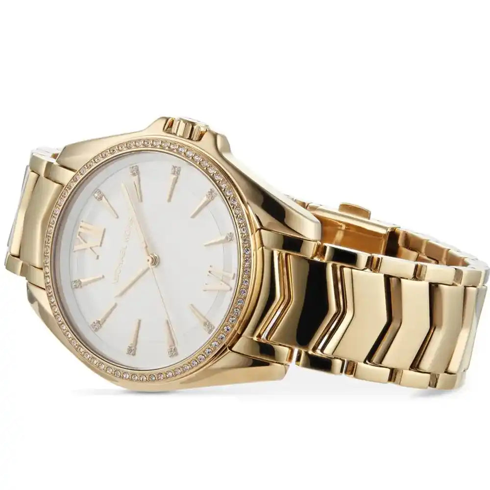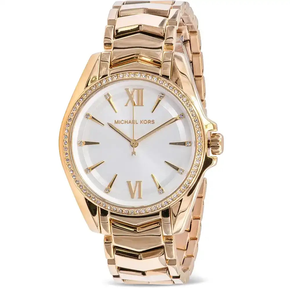 La montre Michael Kors Whitney MK6693 pour femme allie élégance et modernité. Avec son boîtier rond doré de 38 mm, son bracelet en acier inoxydable doré et son cadran blanc raffiné, cette montre analogique à quartz est idéale pour toutes les occasions. Résistante à l’eau jusqu’à 50 mètres, elle allie style sophistiqué et durabilité pour un usage quotidien ou des événements spéciaux.